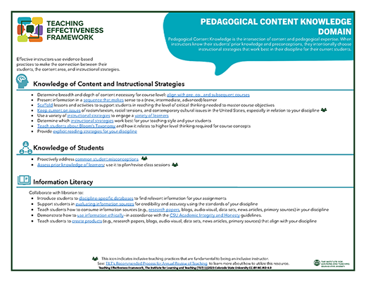 The intersection of content and pedagogical expertise. When instructors know their students’ prior knowledge and preconceptions, they intentionally choose instructional strategies that work best in their discipline for their current students.